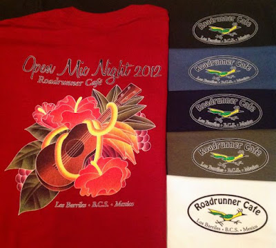 We finally got our Open Mic t-shirts printed. The design was taken from a '40s era menu cover that Donna reproduced on her computer. These are great looking shirts with our logo on the front and "Open Mic Night 2012" on the back above the artwork and "Los Barriles BCS Mexico" below the artwork. They are prewashed 100% cotton. We have sizes Med to XL in the colors shown for 140 pesos or $12 US; XXL in White and Dark Blue only for 150 pesos or $13 US. Available at the Roadrunner Cafe.